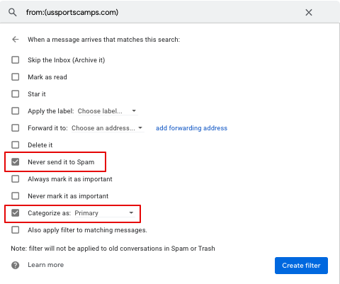 - In the box headed When a message arrives that matches this search: check the boxes labeled Never send it to Spam and Categorize as: and choose the category "Primary"