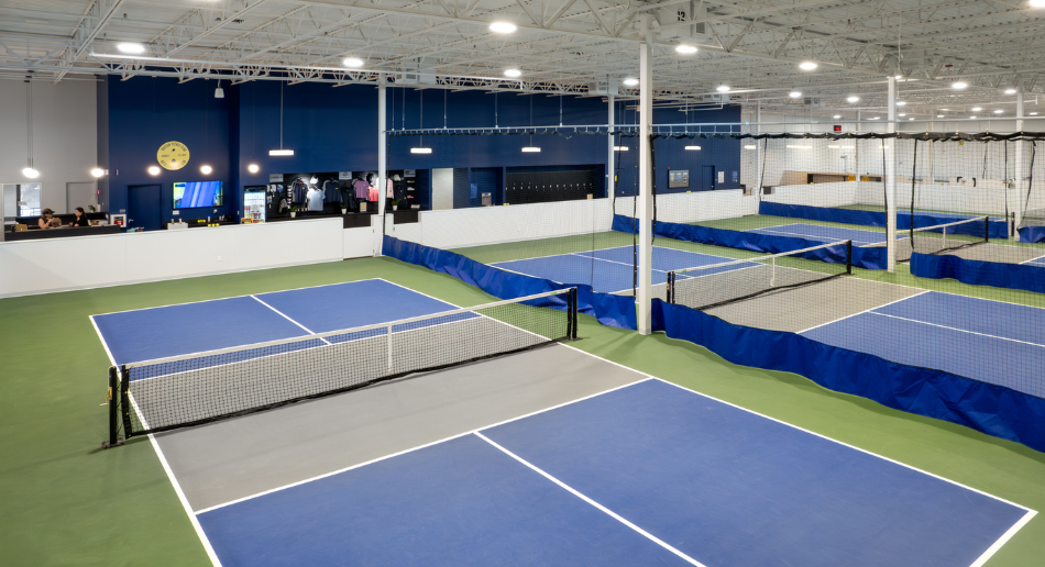 - Facility features 10 indoor courts with Acrytech surfaces and Cushion X technology, along with seven bathrooms, locker storage, and spacious lounge areas